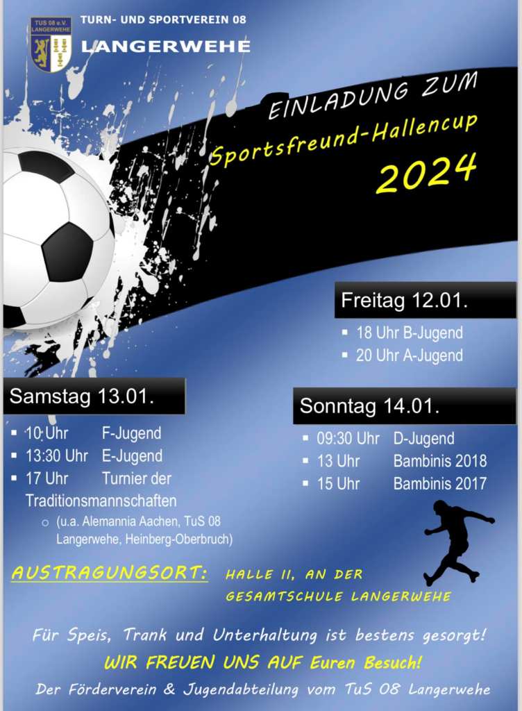 Vom 12. – 14.01.2024 findet, in Kooperation mit dem Verein zur Förderung der Fußballjugend im TuS 08 Langerwehe, in der Halle II an der Gesamtschule Langerwehe unser traditionelles Hallenturnier statt.