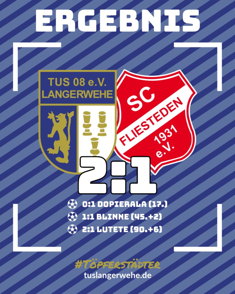 Unsere Mannschaft startete stark in das Spiel und hatte dieses die ersten 15 Minuten klar im Griff. Jedoch ist es SC Fliesteden, die durch die erste gut gespielte Kombination in der 17. Minute in Führung ging. In einem jederzeit hart umgekämpften Spiel übernahm Fliesteden ab da an das Spiel. Max Blinne gelang es dann aber noch in der Nachspielzeit der ersten Halbzeit nach einer Flanke von Kevin Zander auszugleichen. Unsere Mannschaft startete dann bissiger in die zweite Halbzeit und drängte mehr auf den Sieg. Hier sind einige klare Torchancen liegen gelassen worden. Dies hielt die Spannung bis in die letzten Minuten hoch. In der 6. Minute der Nachspielzeit gab es dann einen Elfmeter und Lutete entschied das Spiel verdient für unseren TuS. Geiles Spiel Männer!