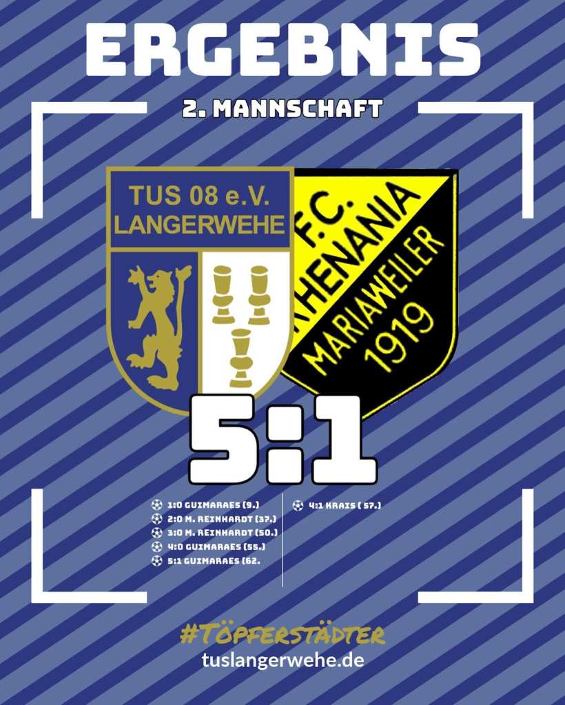 Zweite Mannschaft gewinnt auch das Spiel gegen Rhenania Mariaweiler klar und ungefährdet mit 5:1. Somit behält die Mannschaft die nächsten drei Punkte in Langerwehe. Die Mannschaft von Andreas Semrau zeigte eine gute Leistung und konnte den Schwung aus dem vergangenen Spiel mitnehmen. Klasse Sieg Männer, weiter so!