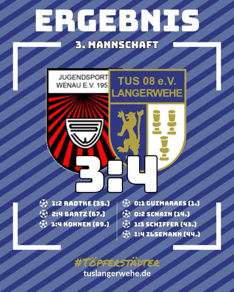 Am Freitag spielte unsere dritte Mannschaft gegen die Zweitvertretung vom JS Wenau. Bereits in der ersten Minute konnte unsere Mannschaft eine Unachtsamkeit durch Guimaraes zum 0:1 verwerten. Man übernahm also bereits früh das Spiel. In der 14. Minute erhöhte Schain auf 0:2. Danach konnte Wenau den Anschlusstreffer erzielen, ehe unsere Mannschaft noch vor der Halbzeit durch Schiffer (43.) und Ilsemann (44.) auf den Halbzeitstand von 1:4 erhöhen konnte. In der zweiten Halbzeit schoss der Gegner noch zwei Tore, war letztlich aber nicht gefährlich genug über 90. Minuten. Ein verdienter Sieg unserer Mannschaft. Glückwunsch!
