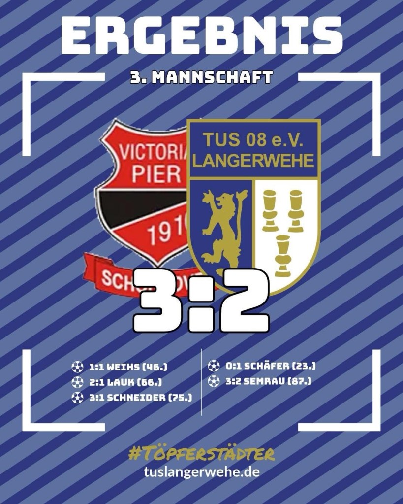 Dritte Mannschaft verliert ihr letztes Spiel ebenfalls. War es der Mannschaft um Trainer Schain noch früh gelungen (23./Schäfer) den ersten Treffer zu markieren, schlug Pier-Schophoven nach der Halbzeit zurück. Durch Treffer in der 46., 66. und 75. Minute wurde das Spiel auf 3:1 gedreht. Kurz vor Schluss gelang Semrau (87.) noch der Anschluss, mehr war leider nicht mehr drin.